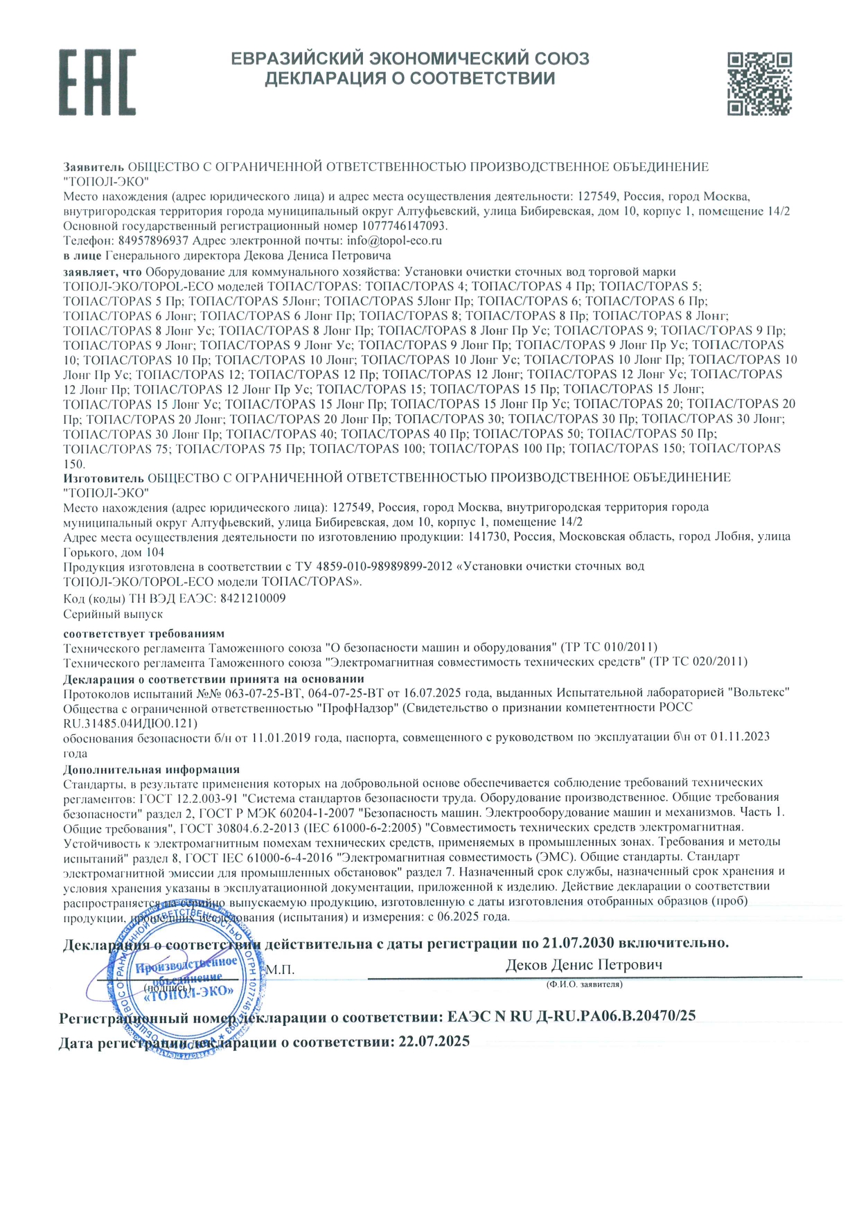 На Топас 6 предоставляется гарантия сроком 36 месяцев со дня его ввода в эксплуатацию и действует при условии, эксплуатации в строгом соответствии с техническим паспортом.